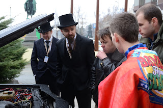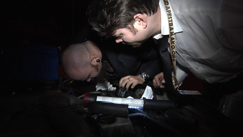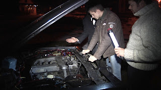 The people at Norauto gave as a rather awesome service! This even if fixing our car is not the kind of thing they usually do. Hopefully we have gotten rid of our overheating problems as we fixed a leak in our cooling system. We got a good look under the car to see all the magnificent rust that is supporting us. We also found that one of the shocks of the car had come loose - that is a thing that could cause truly serious problems. We got all that fixed.The Norauto people did not have the parts to fix our exhaust and sent us searching for an exhaust repair shop. Armed with an address and a description of where to drive we set out on the hunt for the thick tubing needed for our exhaust. Kristian was left behind to get our GPS updated - so we missed the misdirection of Garmin. Trying to figure out the house-numbering system in Budapest was a small challenge and at some point Per said, “Turn left here”. I had a real quick glance in the mirror - saw nothing - the mirror was, as usual slightly out of alignment and almost broadsided the police. They pulled us over. They looked into our car seeing two guys in top hats and suits saying “We are, so, very, very sorry.” - they let us go with a warning to follow the traffic laws.