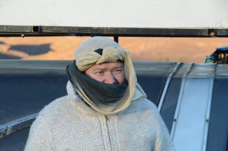 We had a good night of sleep at the Apartment-club. We had quite a few things we wanted to fix before we left the camp... Repacking the car so it is more balanced was not a small task. The area around our car looked like an disorganized landfill. We took of the wheel to angle-grind the wheel-arch. I got quite a few looks and people taking my picture as I was angle-grinding in my suit, top-hat and expedition sun-glasses. All this messing about made us rather late out of camp.