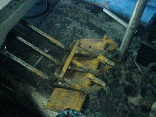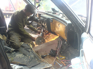 ... they really could put humpty dumpty back together again. It is really a small army working on our car right now. It has been pushed out from the ally and onto the broad sidewalk right next to a machinist shop. Our seats have been ripped out and they have used an angle-grinder to make a hole for the gear-lever. Our break pedal has been removed and we have gotten a new smaller welded in. We are joking that Kristian - who have proven to be a little heavy footed on the break - will break off the pedal and that the resulting carnage is something he will have to explain himself - only helped by the pocket dictionary (Per will try to sleep on).