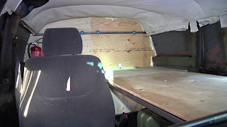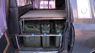 The rebuilding then started. We have splitt the back in two. In the front 2/3 of it, we've put in a single back seat, which wil serve as a resting seat for the guy not driving or navigating. We've also made room for one bed here, which wil be one of our camping beds in the desert, and storage on the road. Undernith it is room for jerry cans.